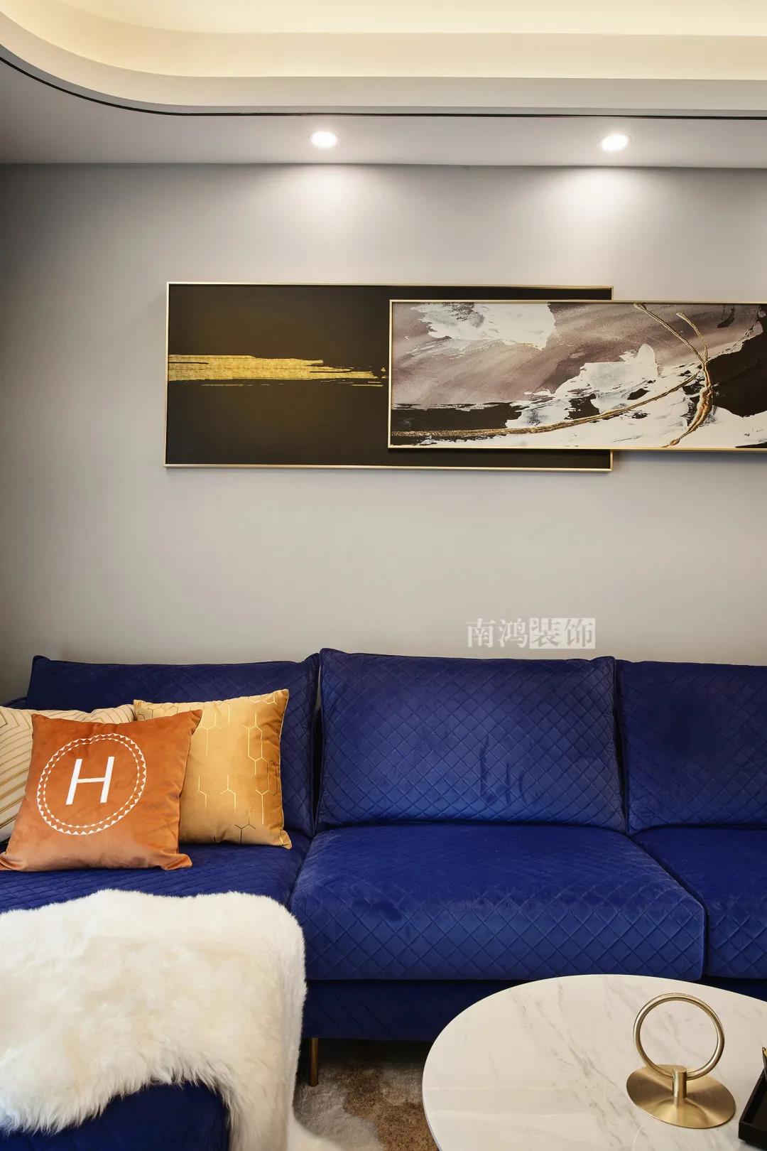 客廳以白灰為主基調,寶藍色絨布主沙發搭配大理石茶幾,空間疏密有致,輕奢氛圍濃厚。