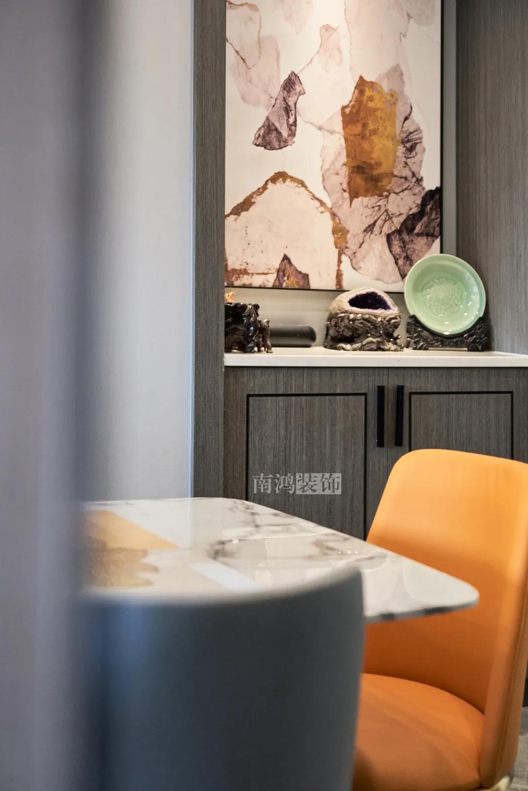 餐廳選用大理石面的餐桌搭配皮藝餐椅,金屬腳增添精致,頂面無主燈足夠簡潔大氣。靠窗臺一側打造了西廚吧臺,平常可以做做簡餐,用來吃早飯或品酒品茶都是很方便的。