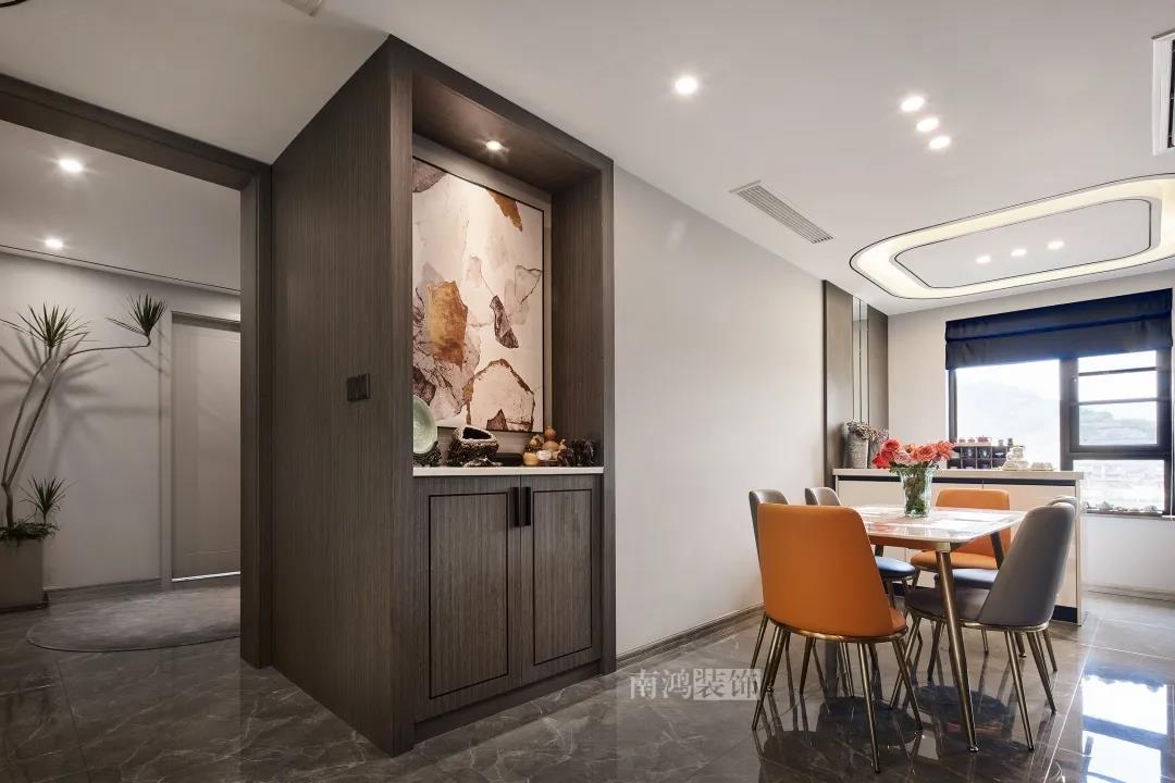 空間內的輕奢精致與現代的簡約美感結合得恰到好處,吊頂一路鋪展至餐廳,南北連貫性極好。