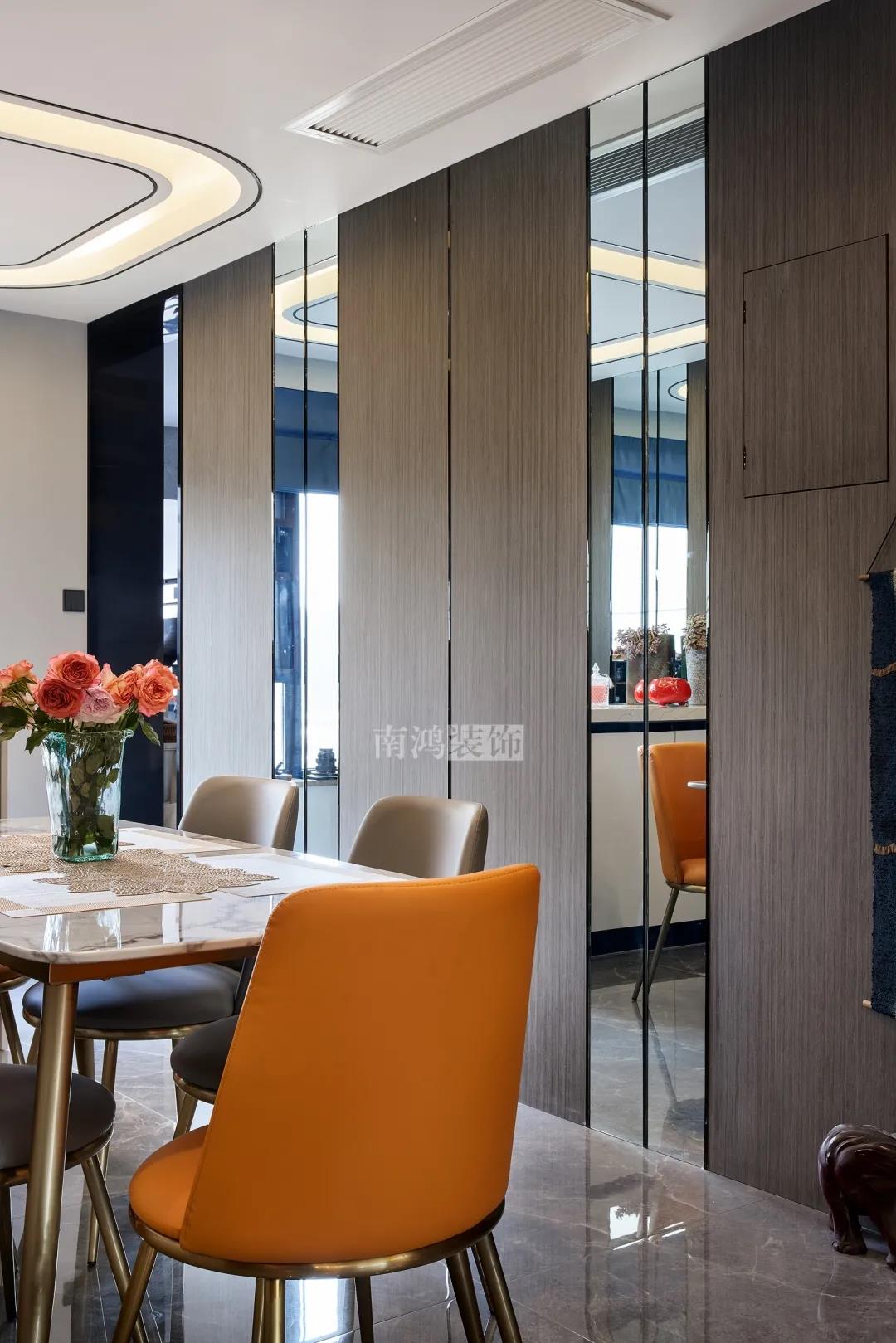為放大空間感和彌補采光,餐廳一側采用鏡面裝飾,加上黑色金屬嵌條,玻璃與金屬的完美配合,帶出優雅的格調。