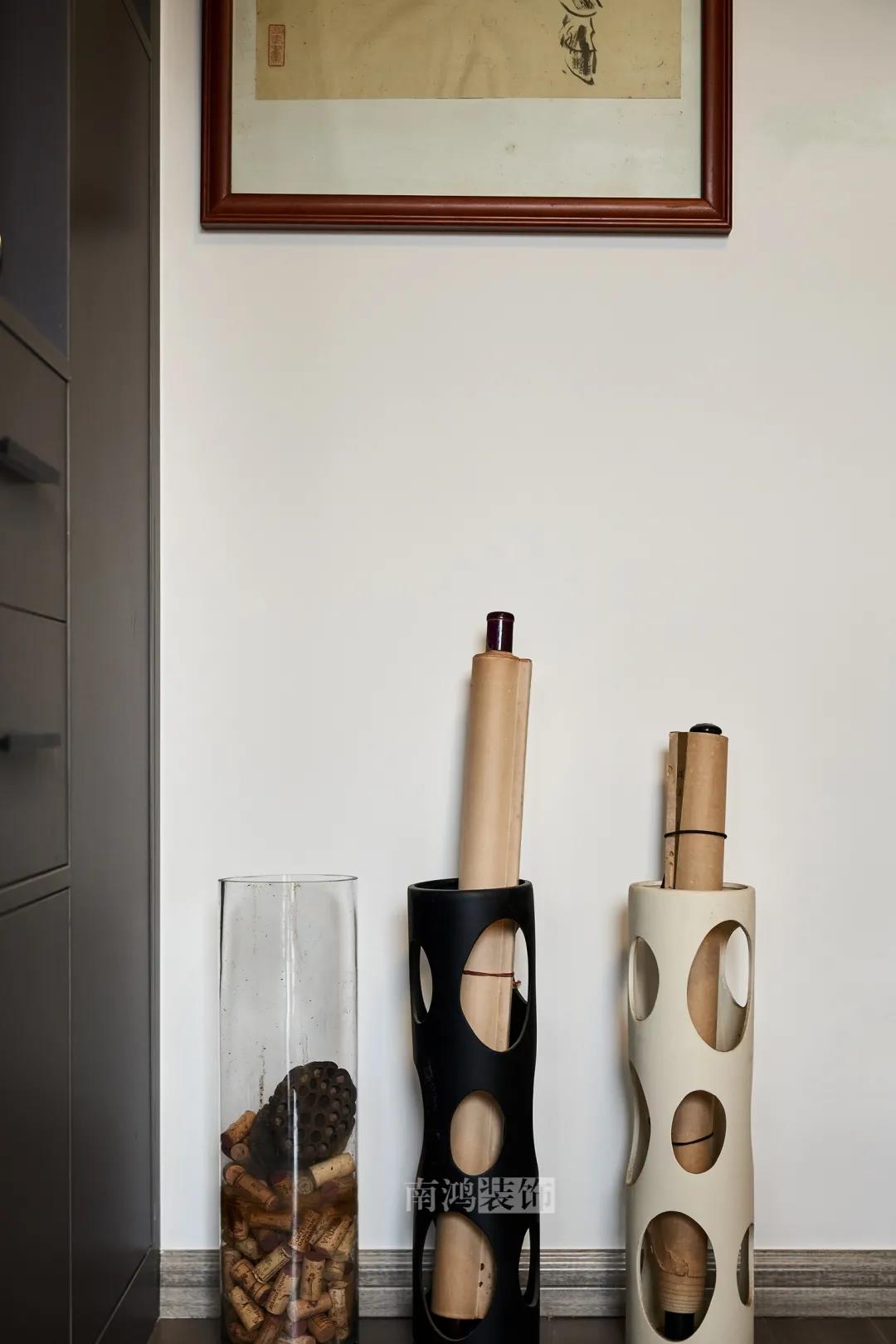 格調滿滿的書房空間,布置精簡但非常有儀式感,一側是深色置物柜,提供充足的空間收納書籍與各種藝術擺件。